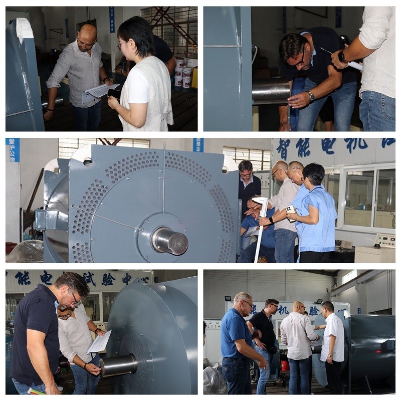 近日,永發(fā)機電喜迎德國客戶一行到訪,雙方就產(chǎn)品交付與相關(guān)合作事宜展開深度洽談。在智能電機試驗中心,客戶逐條比對制作要求,仔細測量、詢問,完成了對YKK-850-8-1240KW 5KV IC511;YKK-850-8/16-1240KW/300KW 5KV IC511等設(shè)備的驗收,并盛贊永發(fā)機電生產(chǎn)效率高、交期快、品質(zhì)過硬。未來,這些電機產(chǎn)品將用于鹽業(yè)生產(chǎn)降溫設(shè)備驅(qū)動,具有高效節(jié)能、低噪聲、質(zhì)量可靠、安裝及使用維護方便等優(yōu)點。